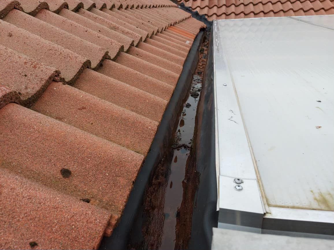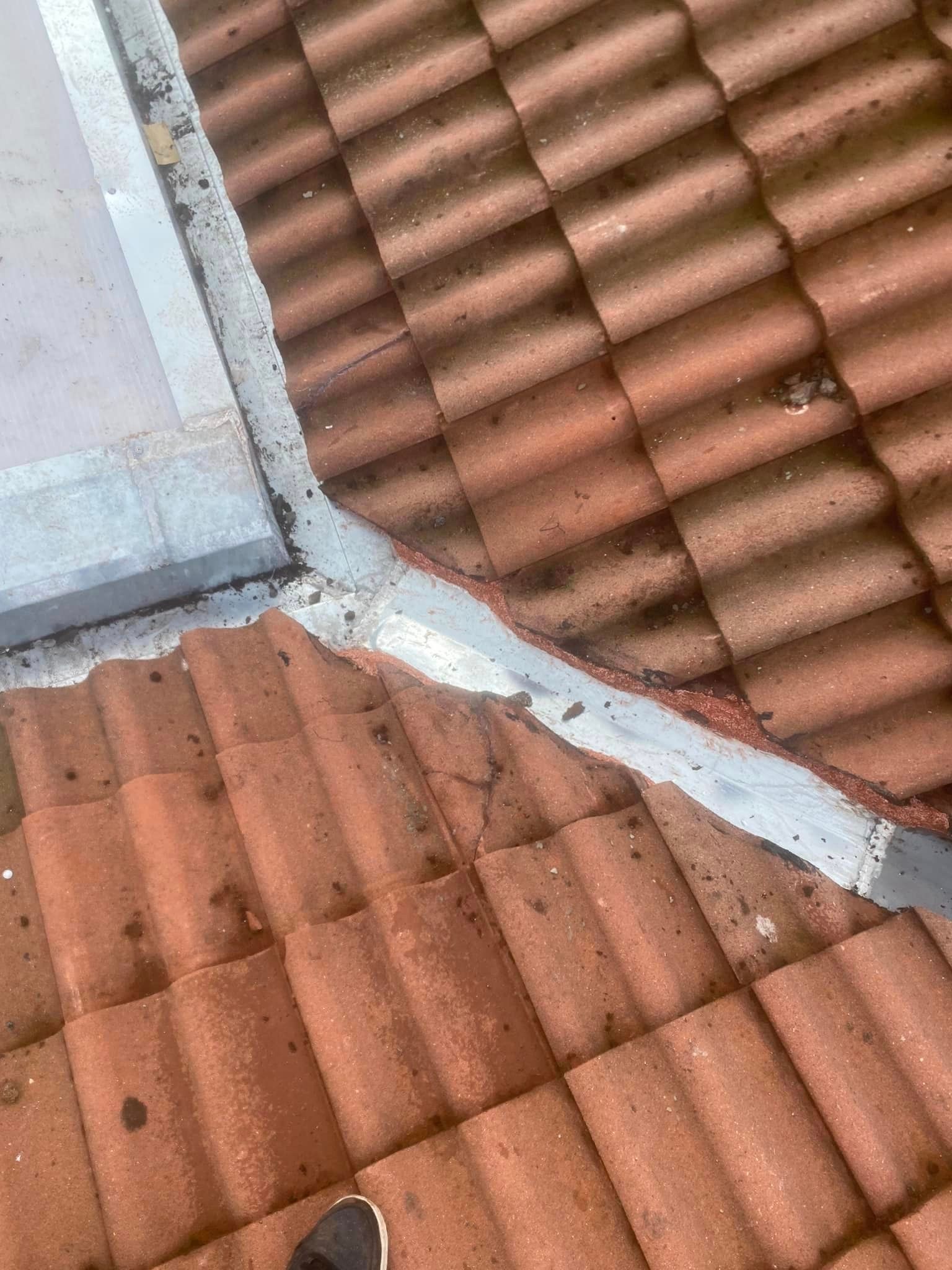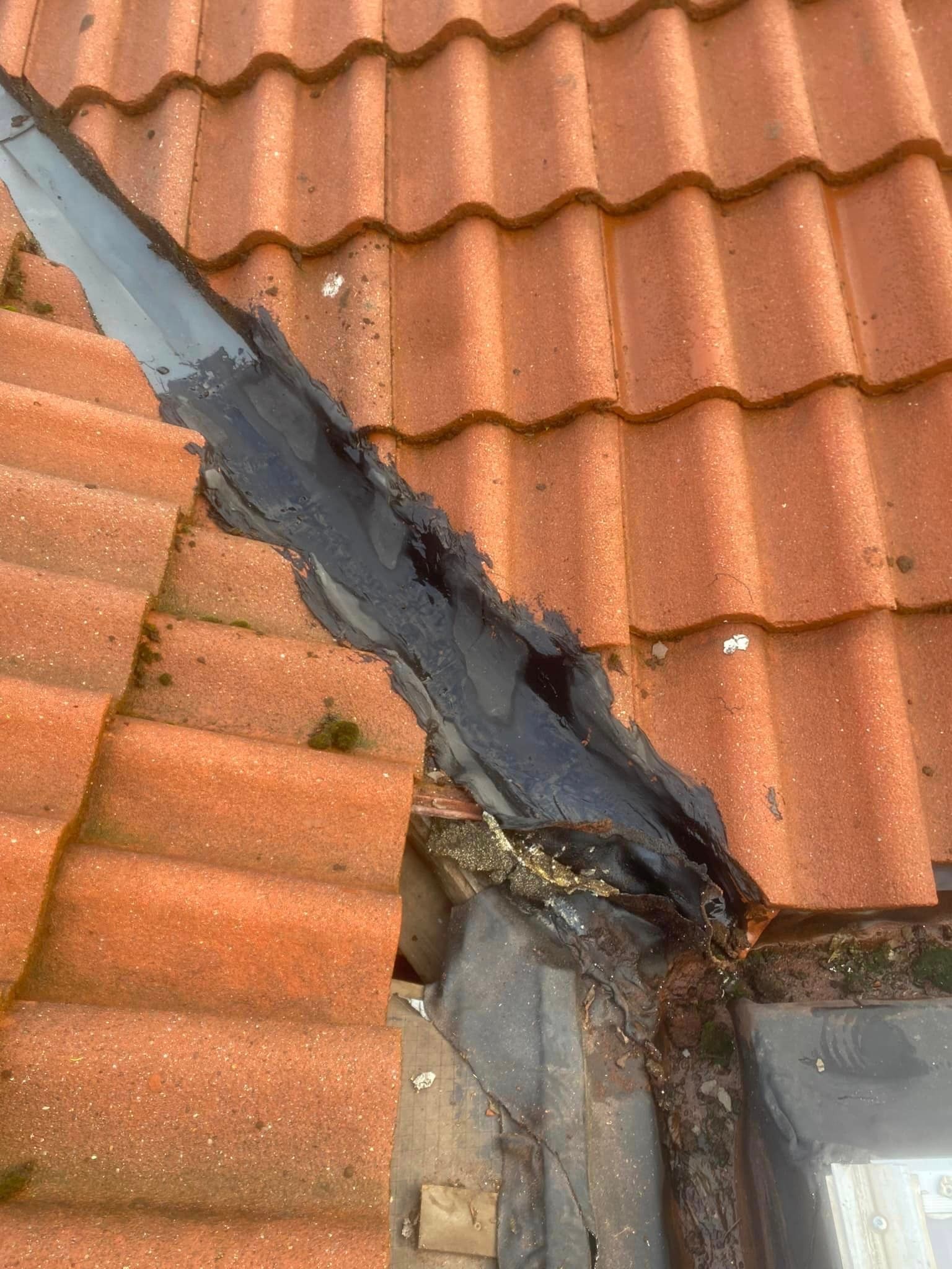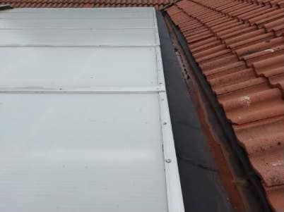 Her har man forsøgt og tætne med inddækning som man normalt bruger på steder med fald på, det altså ikke lavet til at være en tæt rende. Så vi måtte have det hele åbent op og lagt en ny zinkprofil rende i.